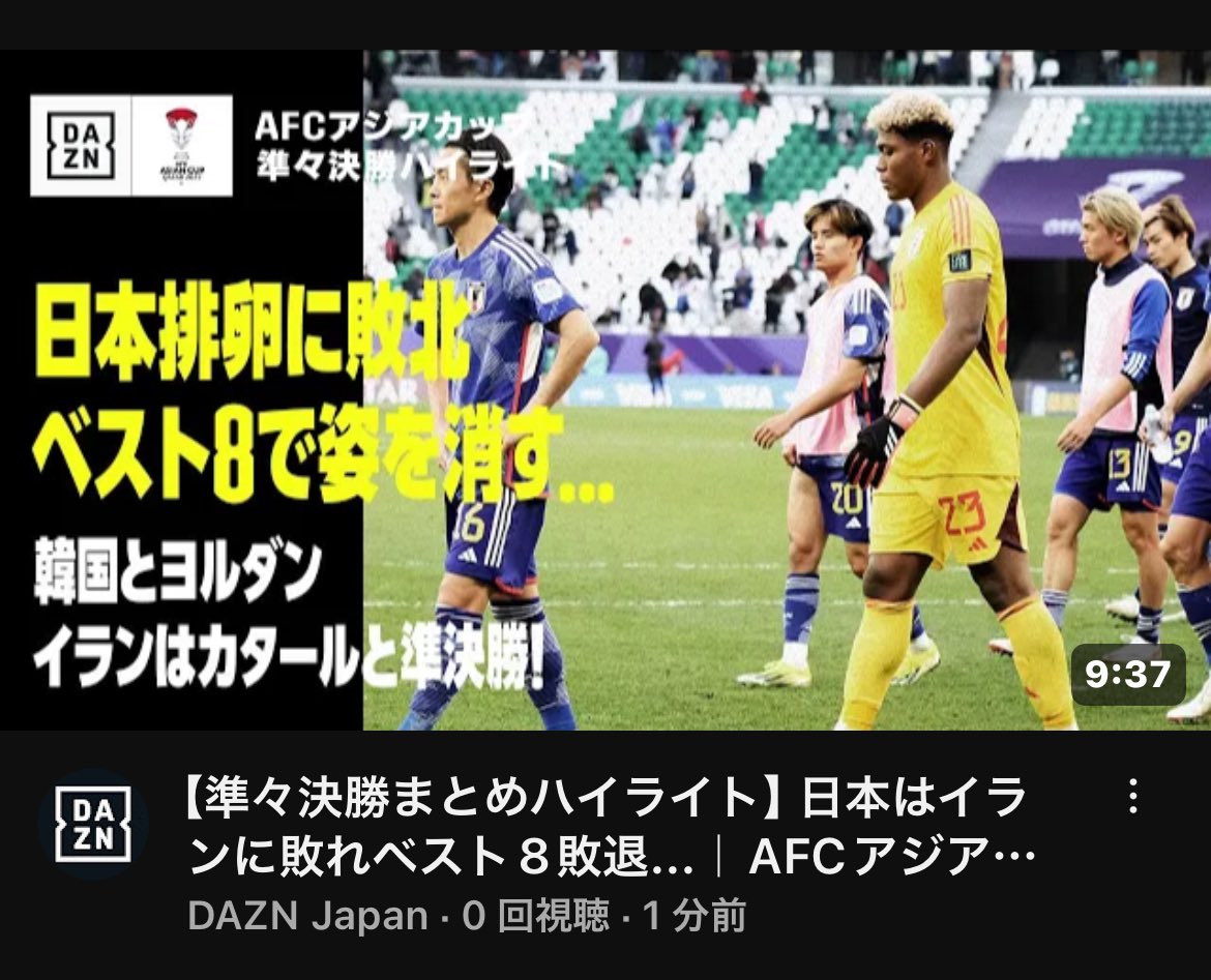 日本代表はアジアの代表チームナンバーワンを決めるアジアカップ準々決勝でイラン代表と対戦し、試合終了間際にPKで決勝ゴールを奪われ1-2の敗戦。8強での敗退が決まった。