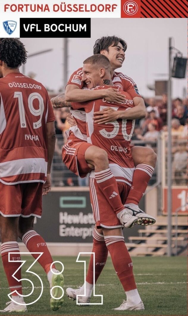 デュッセルドルフは12分、コーナーキックの流れからフリストス・ツォリスが押し込んで先制に成功。15分にはスルーパスに抜け出したフィンセント・フェルメイが角度のないところから流し込んでリードを広げる。